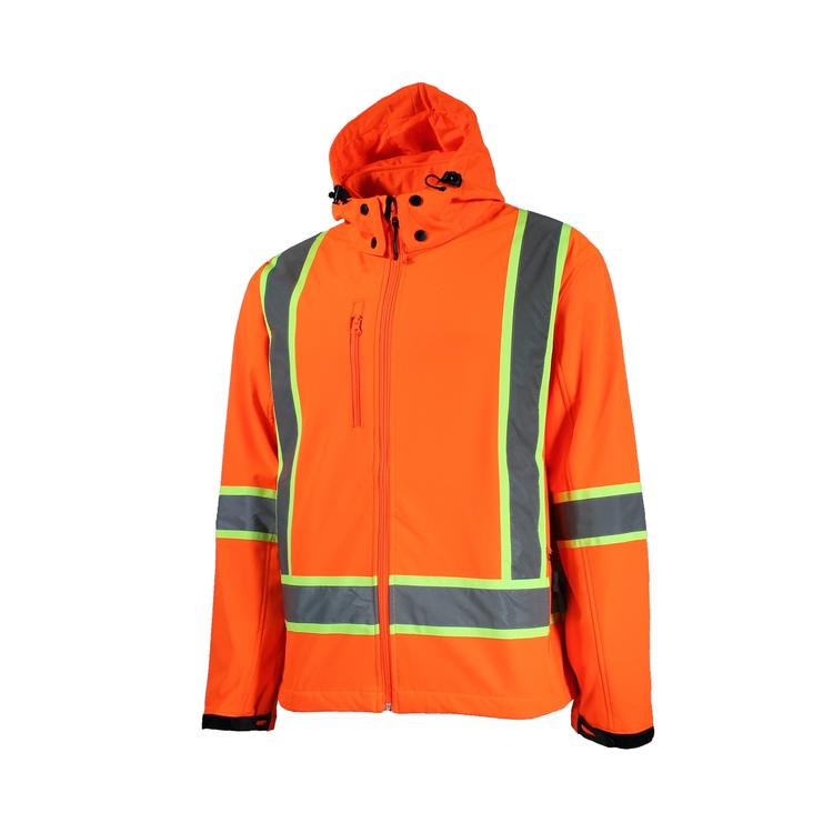 High visibility polyester and pongee spandex softshell coat with 4” reflective strips, 3000mm waterproof, breathable, detachable adjustable hood, velcro on the cuffs, micro fleece interior finish, central zip closure