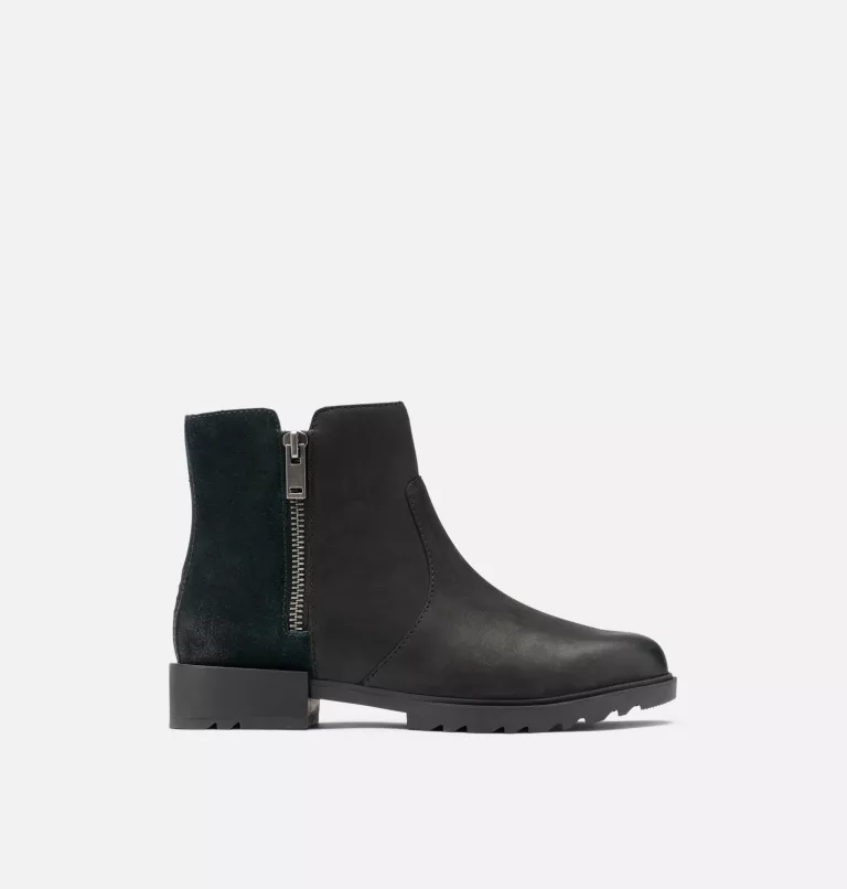 UPPER: A simple ankle bootie that takes her to new places in style. Available in waterproof full grain leather.Zipper on lateral side with gore on medial side for adjustability. Synthetic and canvas lining. Seam-sealed waterproof construction. Zippers are not waterproof.